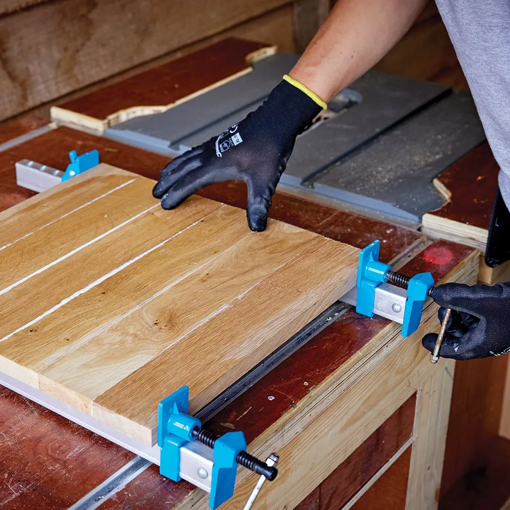 Wykonany w kształcie litery U, z tłoczonego aluminium zacisk z żeliwnym ślizgiem i głowicą. Szybki mechanizm sprężynowy do regulacji, ustawia ślizg w celu skorygowania pozycji na prowadnicy. Głęboko nacięte gwinty Acme umożliwiają ostatecznie napięcie i zastosowanie ciśnienia docisku.