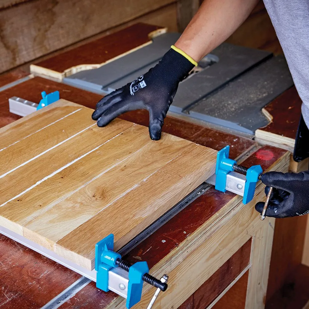 Wykonany w kształcie litery U, z tłoczonego aluminium zacisk z żeliwnym ślizgiem i głowicą. Szybki mechanizm sprężynowy do regulacji, ustawia ślizg w celu skorygowania pozycji na prowadnicy. Głęboko nacięte gwinty Acme umożliwiają ostatecznie napięcie i zastosowanie ciśnienia docisku.