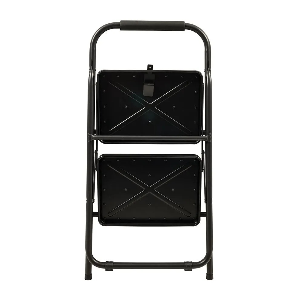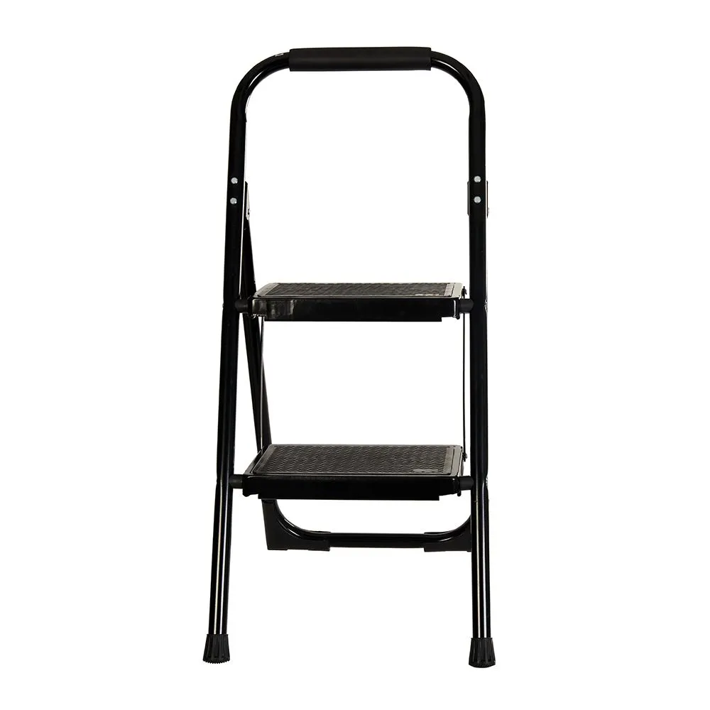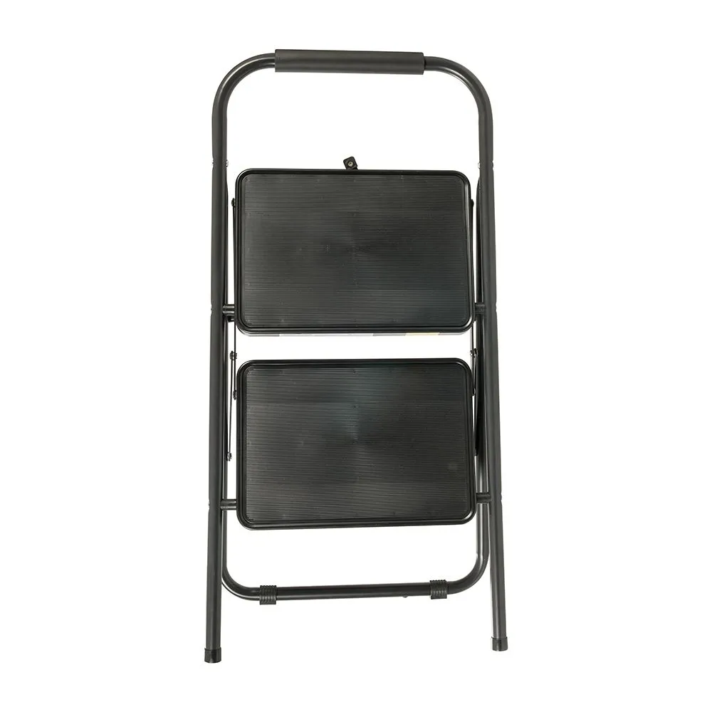 Składana drabina, wykonana ze stalowych rur z 2 szerokimi stopniami antypoślizgowymi. Miękki uchwyt i antypoślizgowe nóżki. Możliwość złożenia ułatwia przechowywanie. Waga 3,75kg. Maksymalna wysokość platformy 475mm. Wymiary po złożeniu 375 x 65 x 880 mm. Nośnność 150 kg. Certyfikowany zgodnie z EN14183.