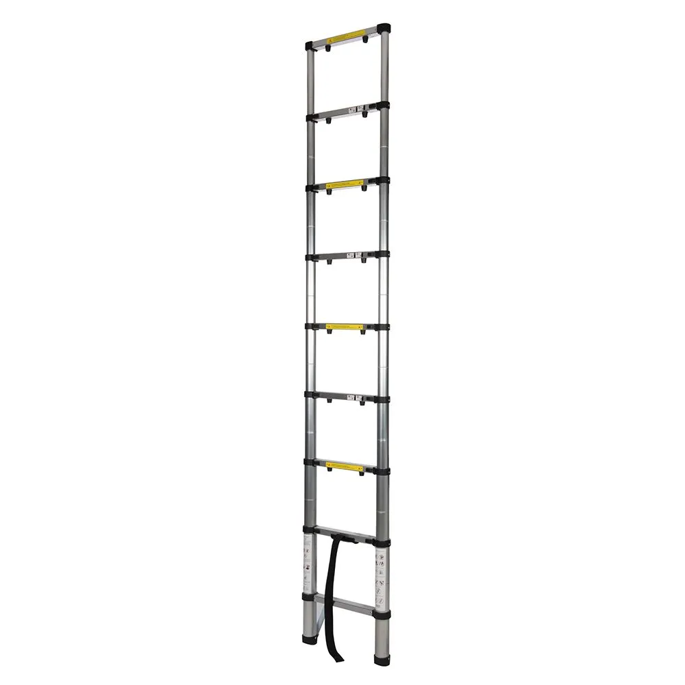 Solidna teleskopowa, drabina aluminiowa, 9 szczeblowa z żebrowanymi antypoślizgowymi stopkami. Uniwersalna, lekka i kompaktowa. Szczeble są wysuwane jeden za drugim do momentu osiągnięcia żądanej wysokości. Bezpieczny mechanizm blokujący. Znajduje idealne zastosowanie wokół domostwa, gdzie konwencjonalne drabiny są zbyt masywne. Wymiary wys. x dł. x szer. (złożona) 855 x 470 x 80 mm. wys. x dł. x szer. (rozłożona): 2600 x 470 x 80 mm. Rozstaw szczebli 270 mm. Po maksymalnym rozłożeniu 2,6 m (8' 5"). Ładowność: 150 kg. Waga 8,6 kg. Zgodna z EN131-6.