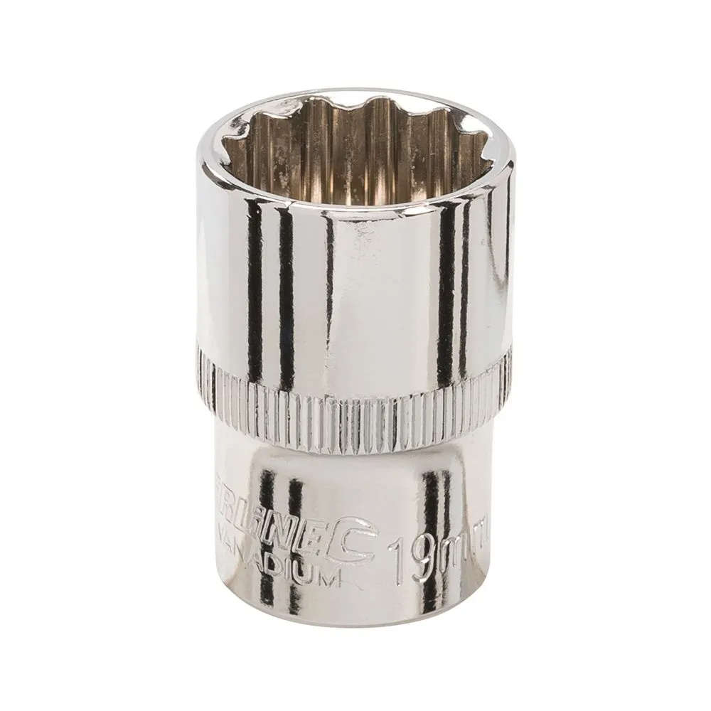12- kątna, podwójnie sześciokątna nasadka dla szybkiej i precyzyjnego przyłożenia do mocowań. Precyzyjnie kuta na zimno, hartowana i odpuszczana stal chromowo-wanadowa. Polerowana, niklowana i chromowana dla trwałej odporności przed korozją. Ścięte krawędzie oraz cienkie ściany dla łatwości w osadzeniu na mocowaniu. Radełkowane pasmo zapewnia kontrolę uchwytu, otwór na kulkę sprężynową zatrzymujący nasadkę.