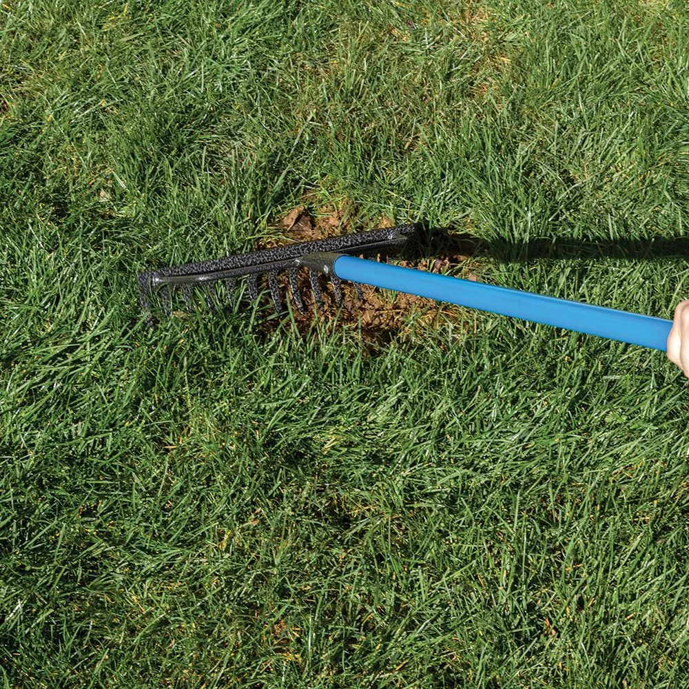 Epoksydowane młotkowe wykończenie części roboczej oraz trzonek rurkowy z wygodnym, czarnym uchwytem i otworem do zawieszenia. Przeznaczone do spulchniania, rozdrabniania, wyrównywania oraz ubijania, jak również do zbierania liści, siana, trawy oraz innych odpadów ogrodowych. 14 zębów (dł. x szer.): 90 x 350 mm.
