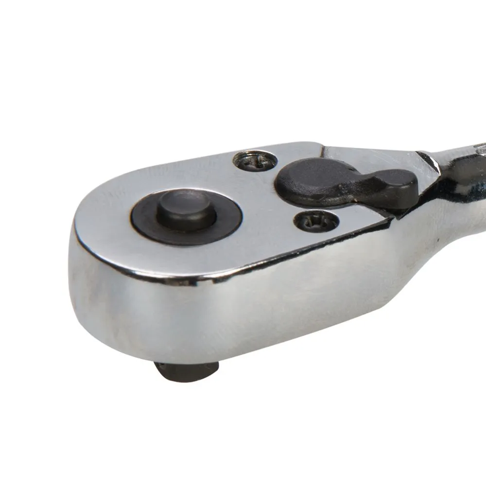 Smukły, ergonomiczny klucz z grzechotką wykonany z hartowanej stali chromowo-wanadowej. Mechanizm odwracalny, blokowania i odblokowywania jedną ręką. Zawiera przekładnie Cro-Mo z momentem obrotowym do 62 Nm, 72 zębami i kątem pracy grzechotki wynoszącym 5°. Wykonany zgodnie z normą DIN 3122.