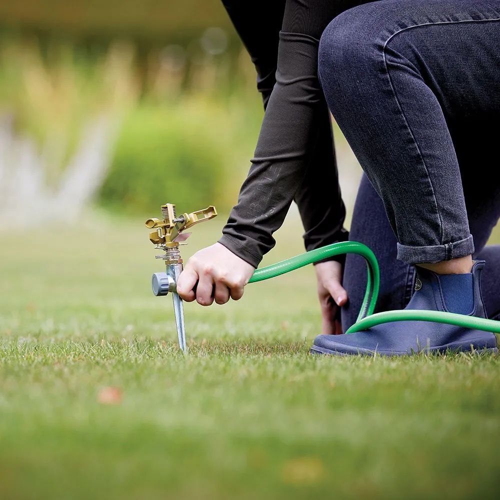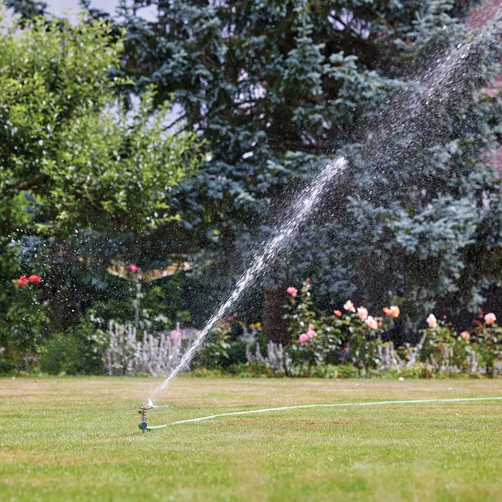 Wbijany zraszacz impulsowy obracający się w zakresie 360°. Regulacja trybu pracy. Uniwersalne złącze na wąż 1/2'' z mechanizmem karuzelowym.