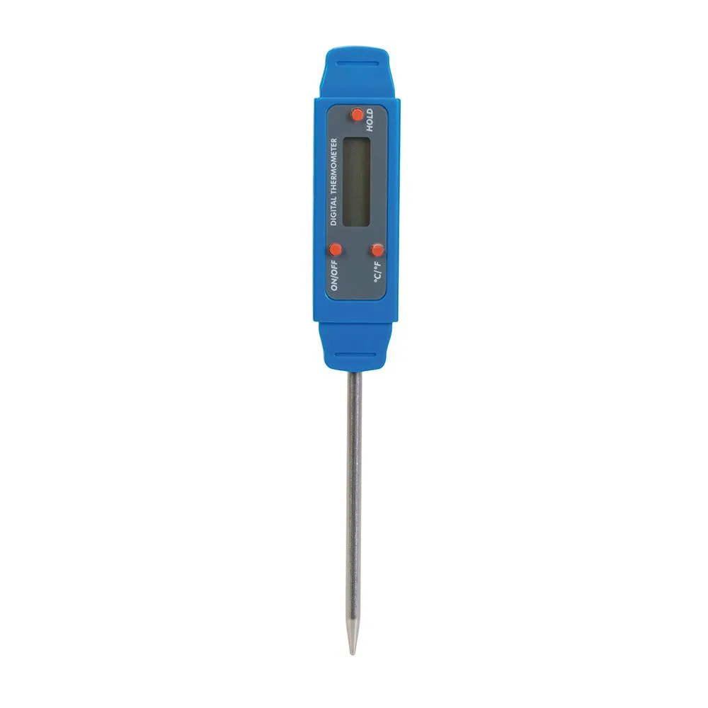 Kieszonkowy termometr cyfrowy. Cienka sonda ze stali nierdzewnej, szybki czas reakcji i funkcja wstrzymania temperatury. Pomiar w skali Celsjusza i Fahrenheita z zakresem od -40°C do +250°C (-40°F do 482°F). Długość całkowita 150 mm. Długość sondy 70 mm. Zawiera 1 x baterię LR44 1,5 V.