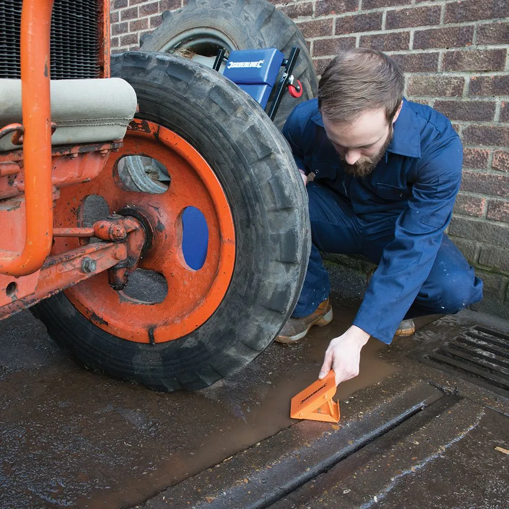 Kliny pod koła w bardzo widocznym jasnym pomarańczowym kolorze. Wytrzymała stal. Zapobiegają poruszaniu się pojazdu. Przeznaczone do samochodów osobowych, przyczep i samochodów dostawczych.