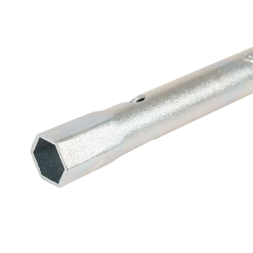 Narzędzie z ocynkowanej stali, odporne na korozję. Do montażu nakrętek do kranów baterii typu mono przy ograniczonym dostępie. W zestawie z pokrętłem do klucza. Długość 180 mm.