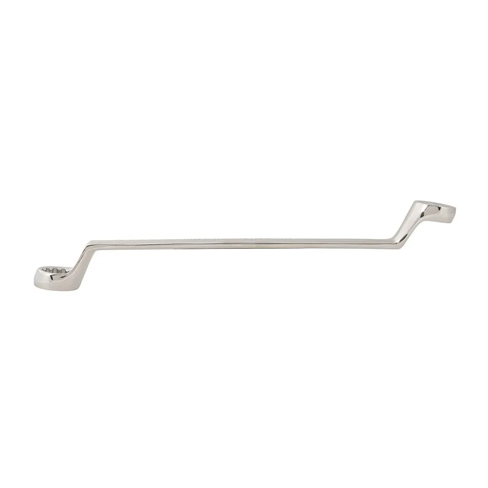 Podwójny metryczny klucz oczkowy wygięty o 75° wykonanay z hartowanej chromowo-wanadowa stali w całości polerowany.