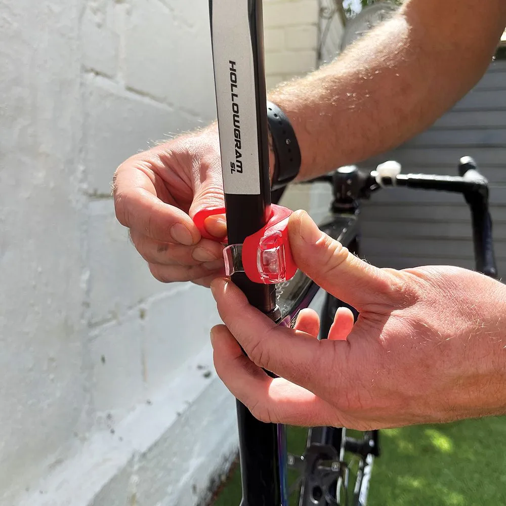 Super jasne diody LED, wodoszczelne, z 3 ustawieniami (światło stałe, wolne i szybkie), 1 x Biała, 1 x Czerwona. Elastyczna opaska silikonowa łatwa do przyczepienia do roweru, torby, kasku itp. 4 x CR-2032 baterie w komplecie.