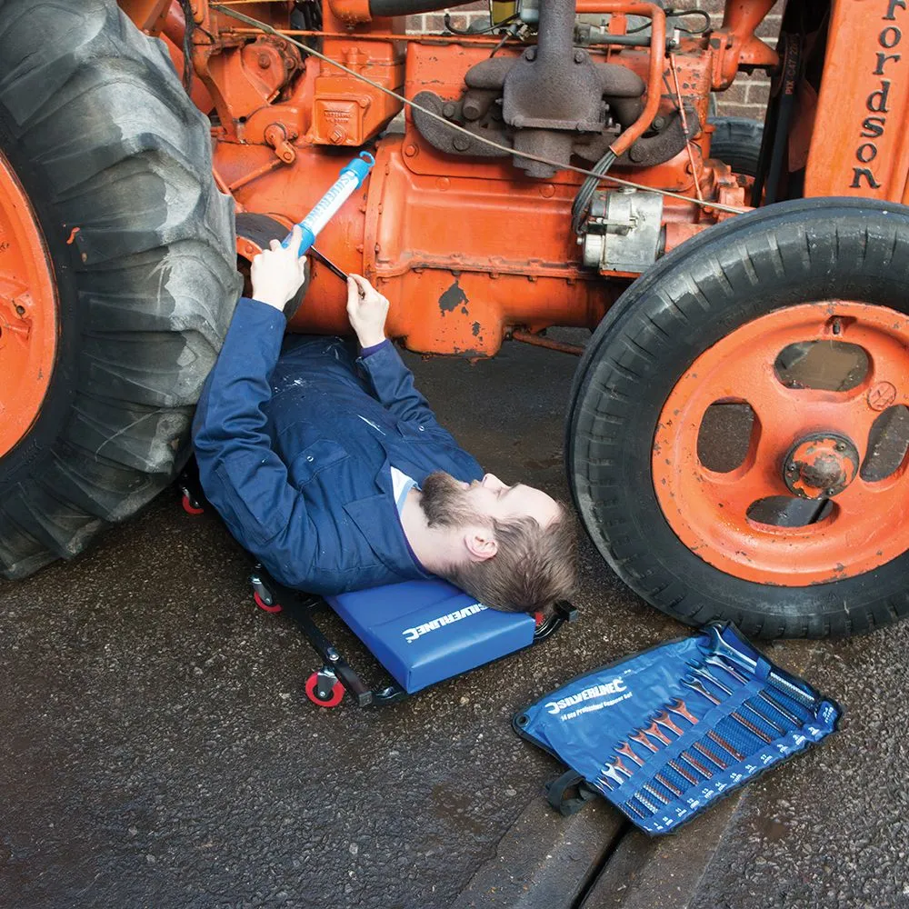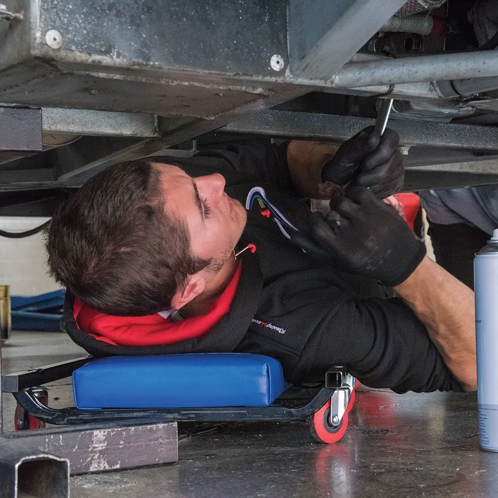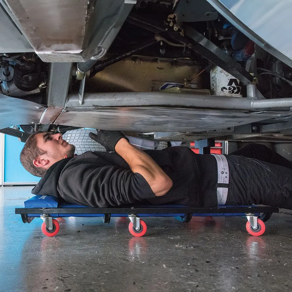 Stalowa konstrukcja z 6 łatwo obrotowymi kompozytowymi kółkami. Komfortowa obita winylem leżanka z zagłówkiem. Wymiary dł. x szer. x wys.: 920 x 460 x 65 mm.
