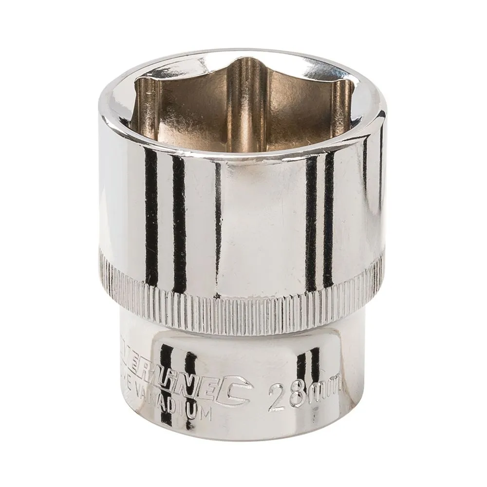 Sześciokątna nasadka dla szybkiej i precyzyjnego przyłożenia do mocowań. Precyzyjnie kuta na zimno, hartowana i odpuszczana stal chromowo-wanadowa. Polerowana, niklowana i chromowana dla trwałej odporności przed korozją. Ścięte krawędzie oraz cienkie ściany dla łatwości w osadzeniu na mocowaniu. Radełkowane pasmo uchwytu z otworem na kulkę sprężynową zatrzymującym nasadkę.