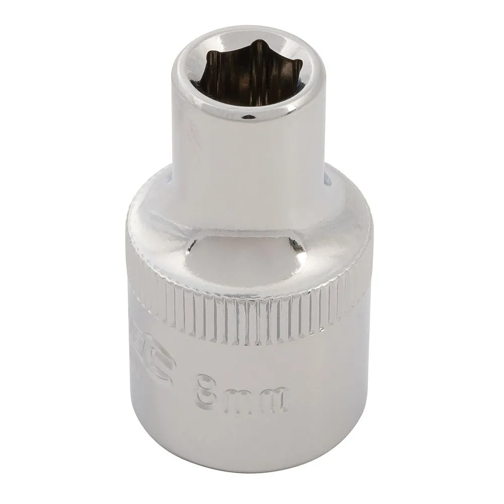 Sześciokątna nasadka dla szybkiej i precyzyjnego przyłożenia do mocowań. Precyzyjnie kuta na zimno, hartowana i odpuszczana stal chromowo-wanadowa. Polerowana, niklowana i chromowana dla trwałej odporności przed korozją. Ścięte krawędzie oraz cienkie ściany dla łatwości w osadzeniu na mocowaniu. Radełkowane pasmo uchwytu z otworem na kulkę sprężynową zatrzymującym nasadkę.