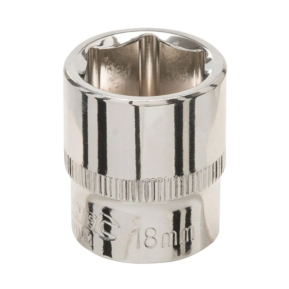 6-punktowa sześciokątna nasadka dla szybkiej i precyzyjnego przyłożenia do mocowań. Precyzyjnie kuta na zimno, hartowana i odpuszczana stal chromowo-wanadowa. W pełni polerowana, niklowana i chromowana dla trwałej odporności przed korozją. Ścięte krawędzie oraz cienkie ściany dla łatwości w osadzeniu na mocowaniu. Radełkowane pasmo uchwytu z otworem na kulkę sprężynową zatrzymującym nasadkę.