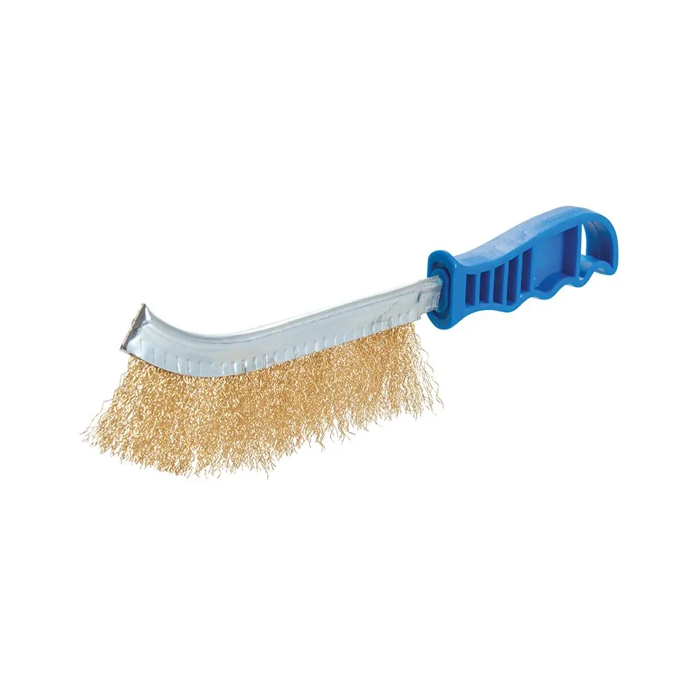Poliuretanowa rękojeść. Stalowa szczotka pokryta mosiądzem przeznaczona do usuwania rdzy oraz lekkich prac czyszczących. Długość całkowita 240 mm.