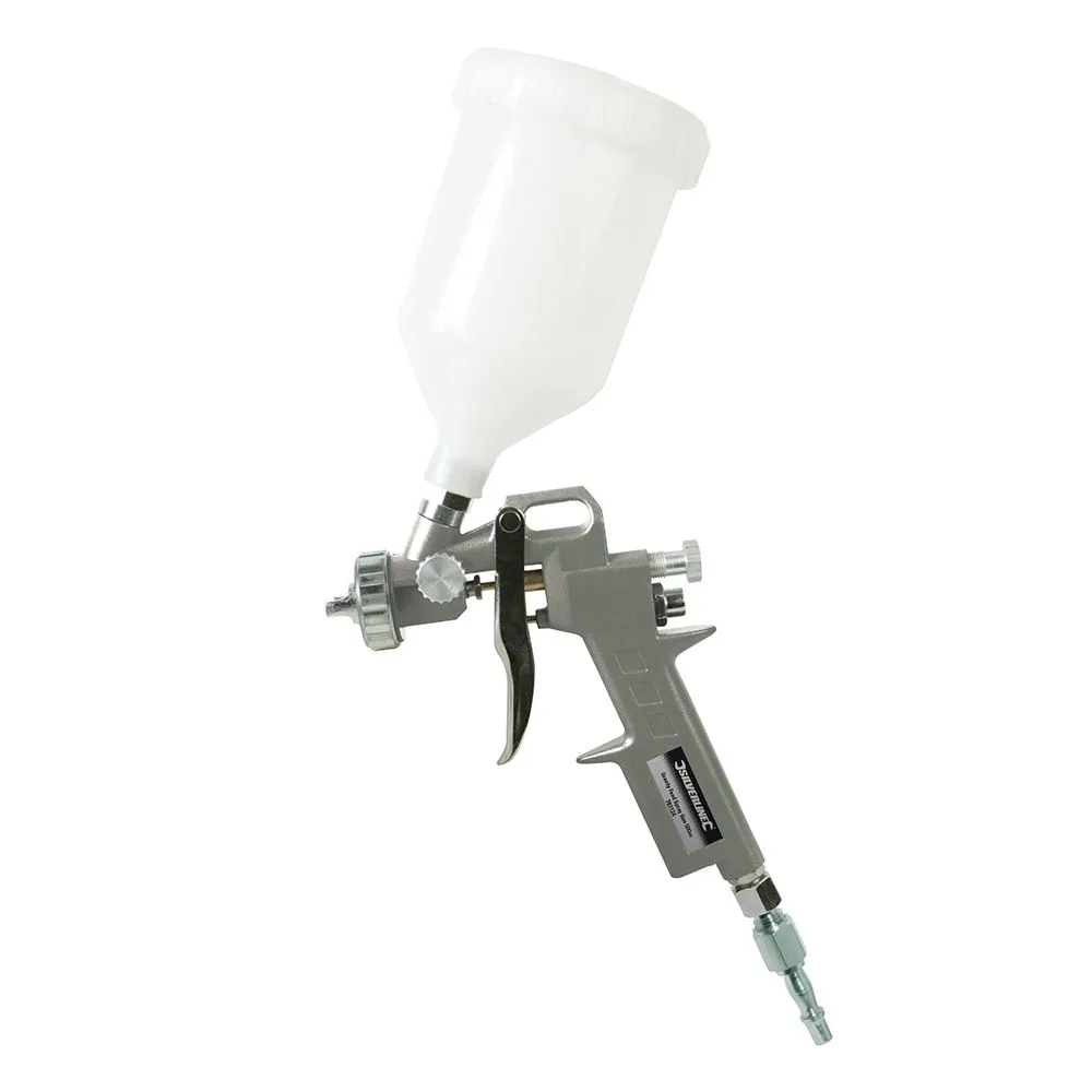 Oddzielne sterowanie dla przepływu płynu oraz kontroli spustu o podwójnym działaniu. 1,5 mm dysza. Nylonowy pojemnik 500 ml. W zestawie zarówno brytyjskie i europejskie szybkozłącze 1/4".