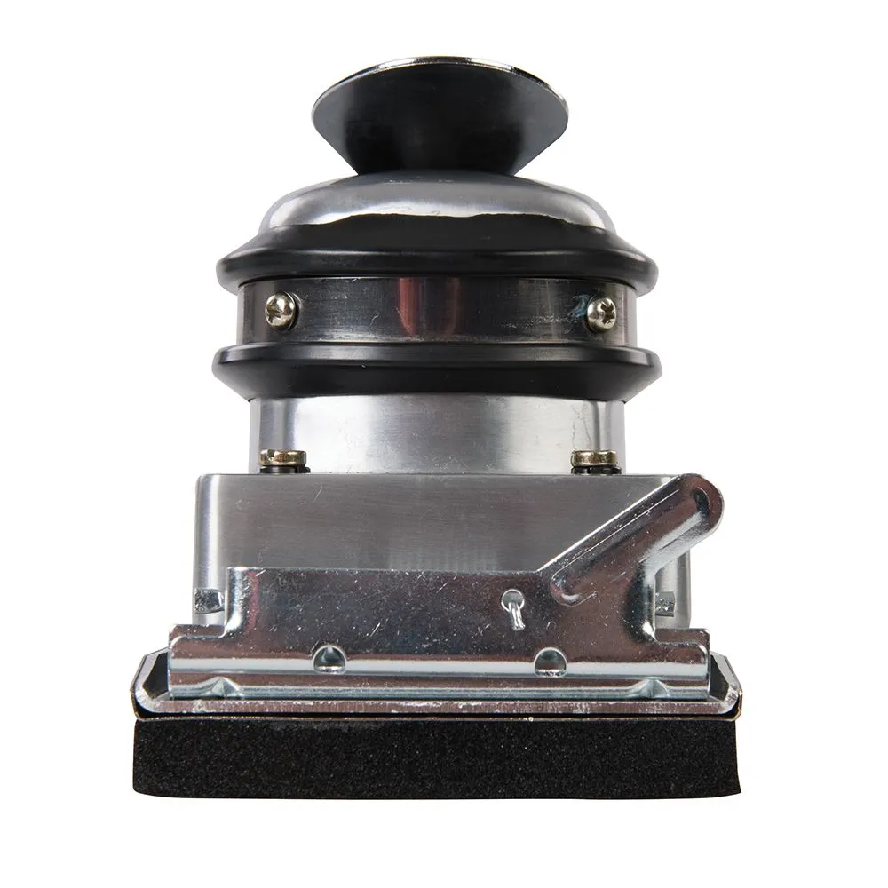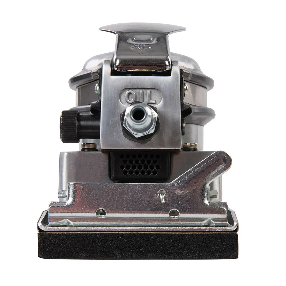 Korpus odlewany ze stopu aluminium z gumowym uchwytem, automatyczne zwolnienie spustu oraz tłumnik drgań. Papier ścierny utrzymywany przez zaciski. Tylny układ wydechowy pomaga zmniejszyć hałas i zwiększyć kontrolę kurzu. W zestawie zarówno szybkozłącze brytyjskie jak i europejskie 1/4". Wymiary nakładki szlifującej: 90x170x12 mm. Prędkośc bez obciążenia 8000 min-1. Zużycie powietrza 135 L/min (4,75 cfm).