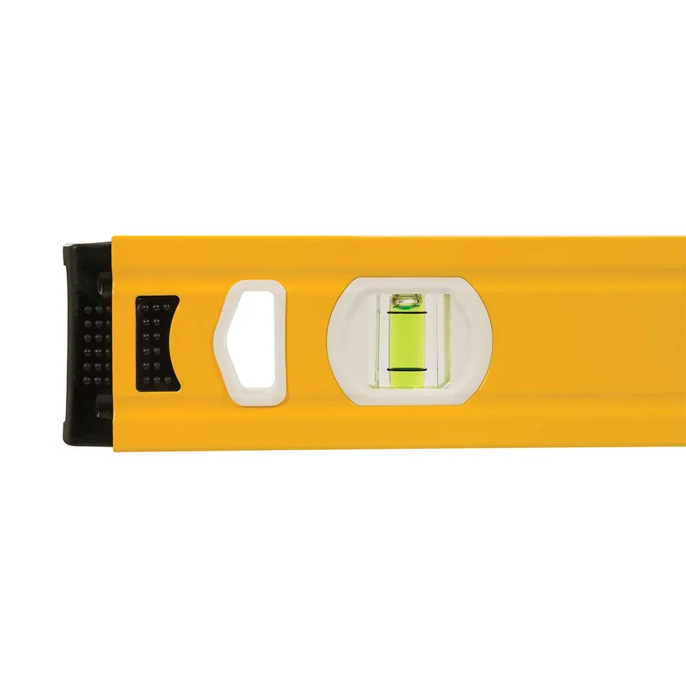 Malowana proszkowo, wytłaczana konstrukcja aluminiowa 1,1 mm. rezowana dolna i górna podstawa dla zwiększenia dokładności ustawienia. Żebrowane boki, ochronne nakładki oraz otwór do zawieszenia. Libelle : 45 °, 90 ° i 180 ° wysoce widoczne, odporne na promieniowanie UV. Dokładność 1 mm/m.