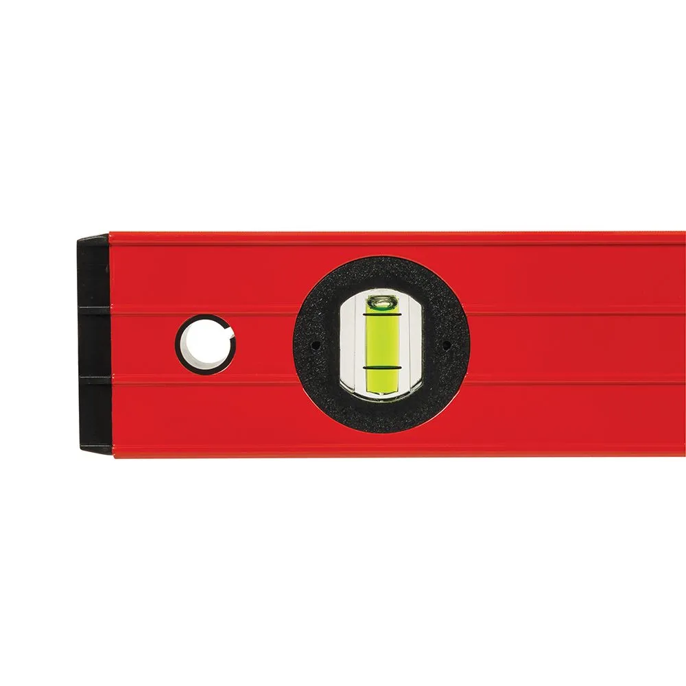 Malowana proszkowo, wytłaczana konstrukcja aluminiowa 1,2 mm. rezowana dolna i górna podstawa dla zwiększenia dokładności ustawienia. Żebrowane boki, ochronne nakładki oraz otwór do zawieszenia. Libelle : 45 °, 90 ° i 180 ° wysoce widoczne, odporne na promieniowanie UV. Dokładność 1 mm/m.