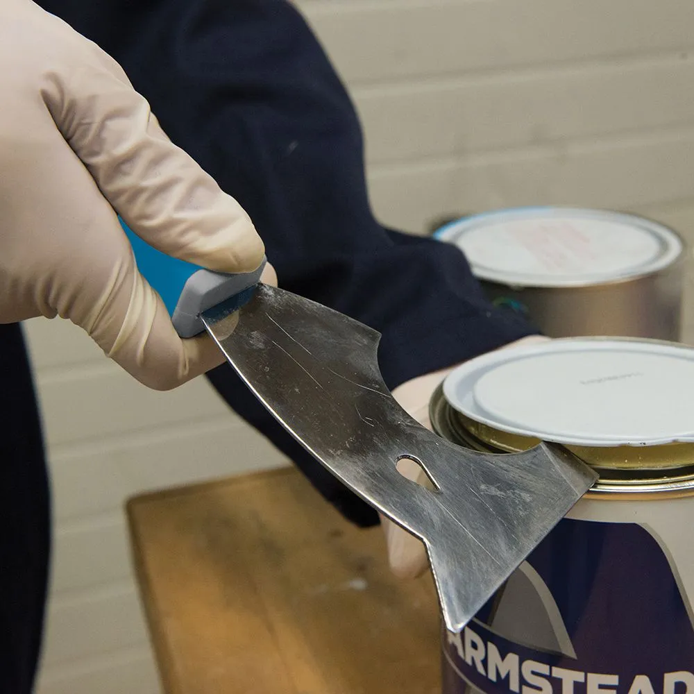 Wielofunkcyjny skrobak o tradycyjnej krawędzi i kątach 45° i 90° z zaokrąglonym ostrzem do czyszczenia wałków malarskich, z otworem do wyciągania gwoździ i metalową końcówką, którą można dobić gwoździe do płyt gipsowo-kartonowych. Otwór do zawieszenia.