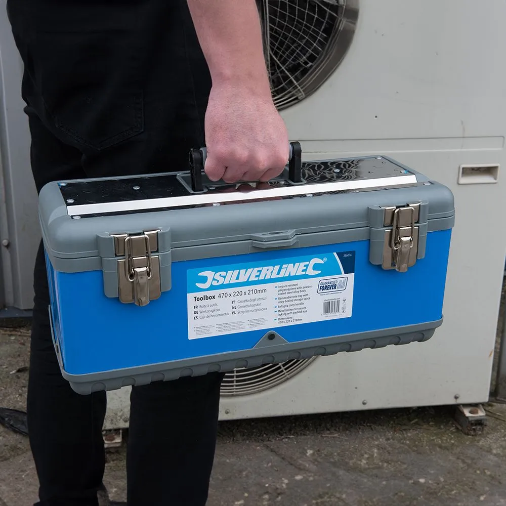Wykonana z odpornego na uderzenia polipropylenu oraz malowanym proszkowo korpusem ze stali stopowej z wygodnym uchwytem Softgrip. Metalowe zatrzaski do bezpiecznego blokowania z uchem na kłódkę. Zapewniają dużą pojemność z miejscem dla różnorodnych narzędzi.