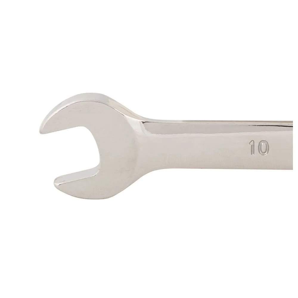 Hartowana stal chromowo-wanadowa klucza metrycznego z polerowanym wykończeniem. Chromowana stal zapobiega korozji. Grzechotka 5°. Zapewnia łatwy dostęp w ciasnych przestrzeniach.