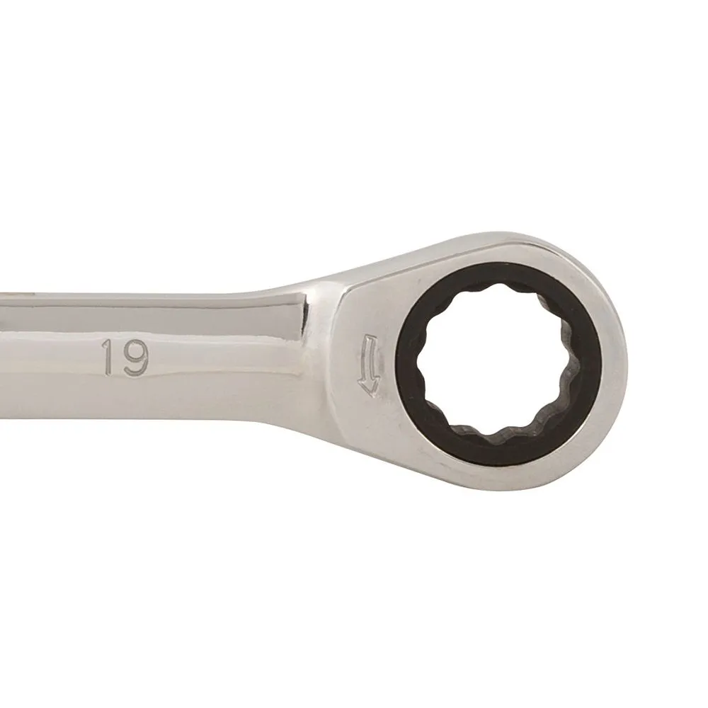 Hartowana stal chromowo-wanadowa klucza metrycznego z polerowanym wykończeniem. Chromowana stal zapobiega korozji. Grzechotka 5°. Zapewnia łatwy dostęp w ciasnych przestrzeniach.