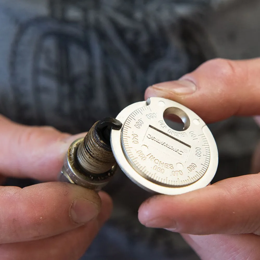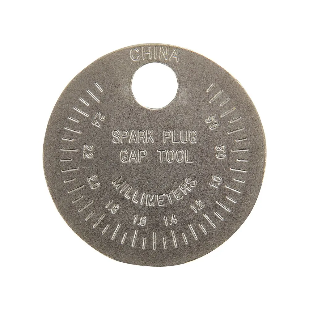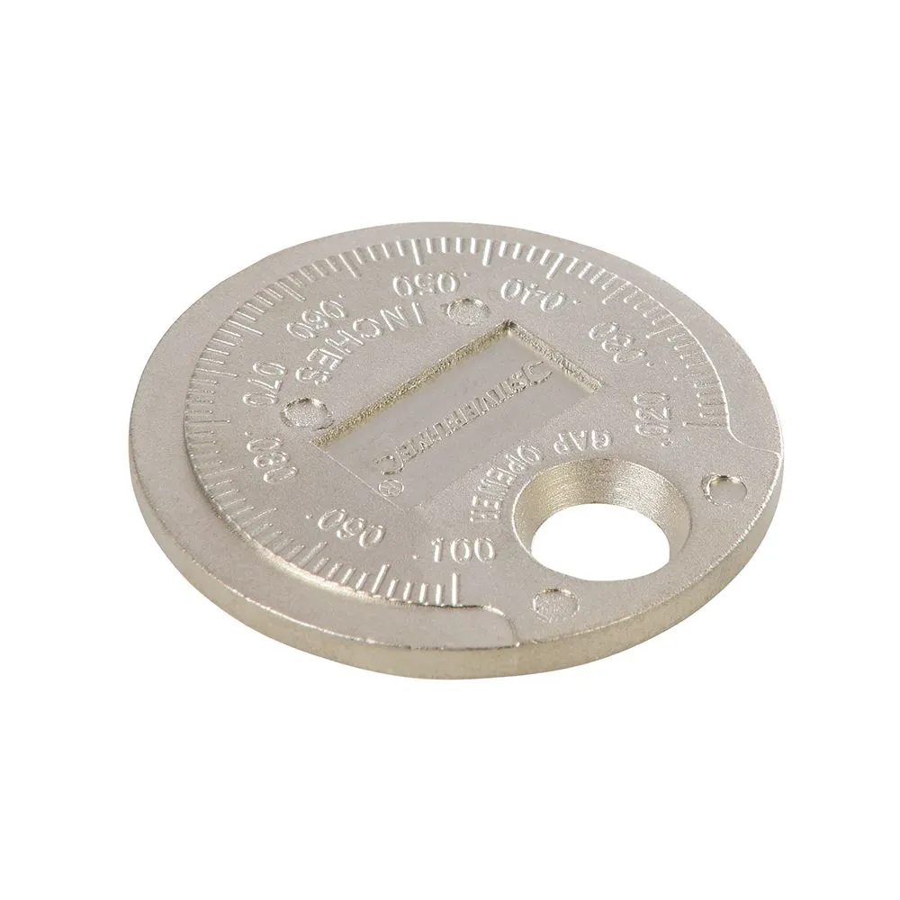 Solidny stalowy szczelinomierz w kształcie monety z kołnierzowym otworem umożliwiającym regulację przewodu bocznego bez uszkodzenia elementu środkowego. Zewnętrzna obręcz do pomiaru szczeliny elektrod. Wymiary: metryczne (0,5 - 2,55 mm) oraz imperialne (0,02 - 0,1"). Solidna stal stopowa