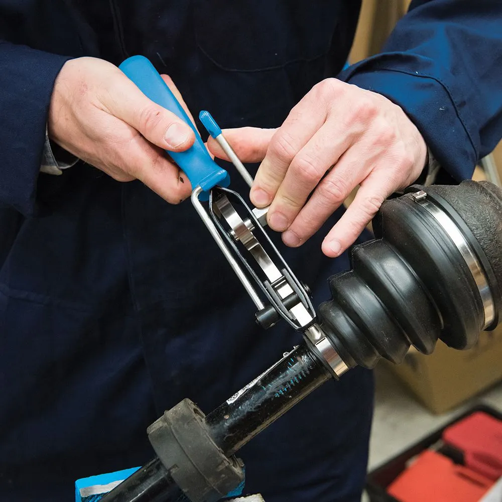 Stal węglowa narzędzia do instalacji opasek taśmowych. Przyrząd służy do zaciskania i cięcia opasek bezkońcowych na przegubach napędowych oraz przewodach elastycznych. Wbudowany obcinak tnie opaskę przez przesunięcie dźwigni w przód. Duża, wygodna rękojeść.