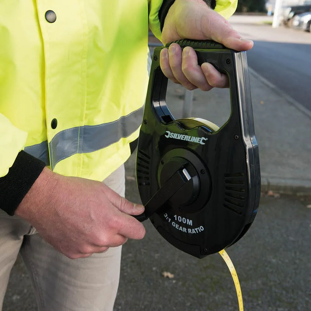 Taśma ze stali z odpornym na korozję magnetycznym klipsem. Manualna przekładnia 3:1 daje szybkie i w pełni kontrolowane zwijanie taśmy. Wygodny, wyprofilowany uchwyt i wyraźna, łatwe do odczytania podziałka ze skalą metryczną i imperialną.