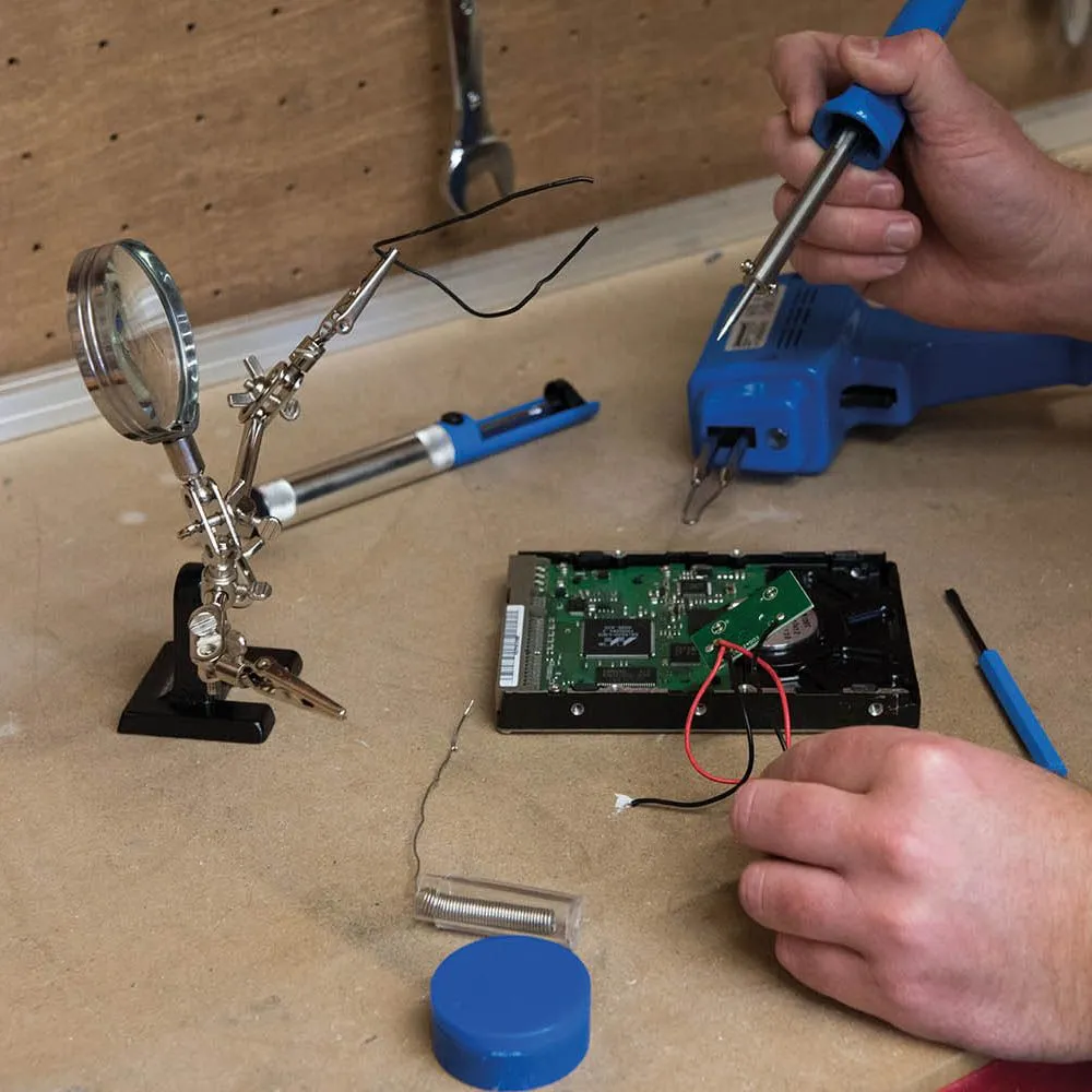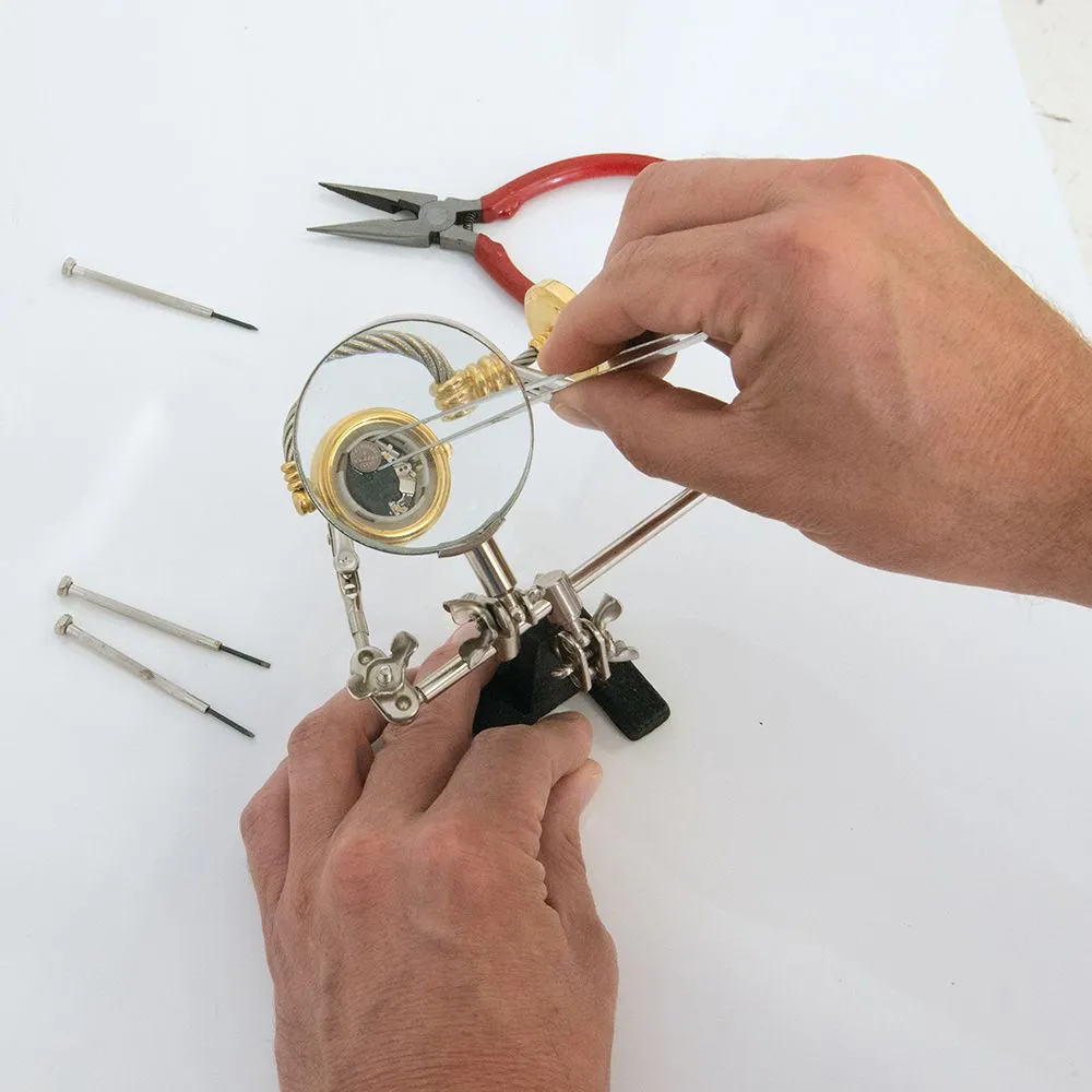 Uniwersalne urządzenie do przytrzymywania obiektów w stałej pozycji podczas montażu, lutowania lub malowania, w modelarstwie, elektronice i innych rzemiosłach. Zawiera 2 w pełni regulowane ramiona z zaciskami krokodylkowymi oraz ciężką podstawę zapewniającą stabilność uchwytu. Soczewka 63 mm 2,5 x. Wysokość x długość x szerokość: 170 x 185 49 mm. Waga 0,3 kg.