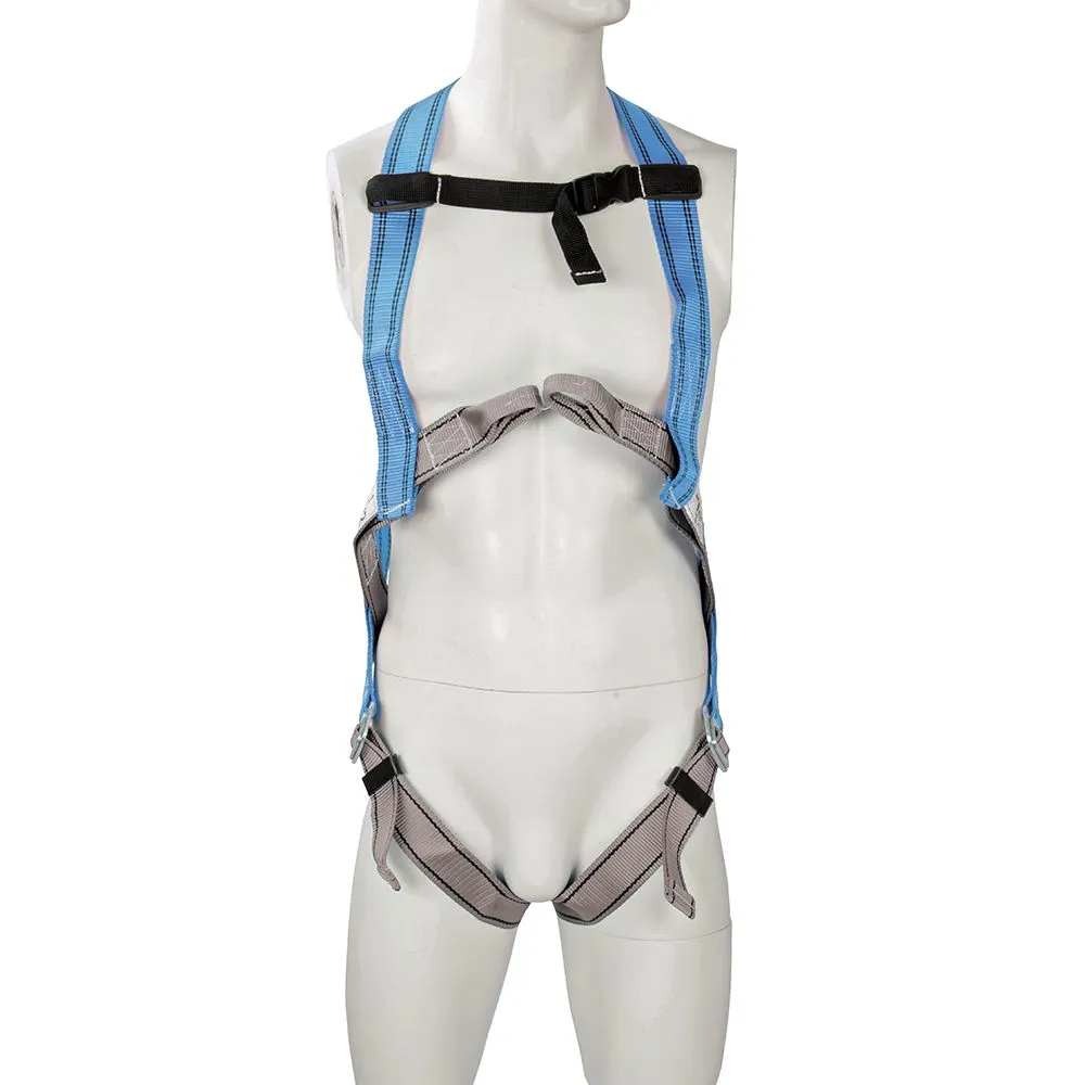 Uprząż i lonża wykonane z poliestrowego pasu parcianego z okuciami ze stali nierdzewnej, absorbujące energię. Uprząż z grzbietowym pierścieniem D kształtnym. Lonża pochłaniająca energię z hakiem do rusztowań i karabińczykiem ze stali stopowej. Przetestowane i certyfikowane zgodnie z normami EN354, EN355, EN361, EN362 oraz EN365. W komplecie z torbą do przechowywania.