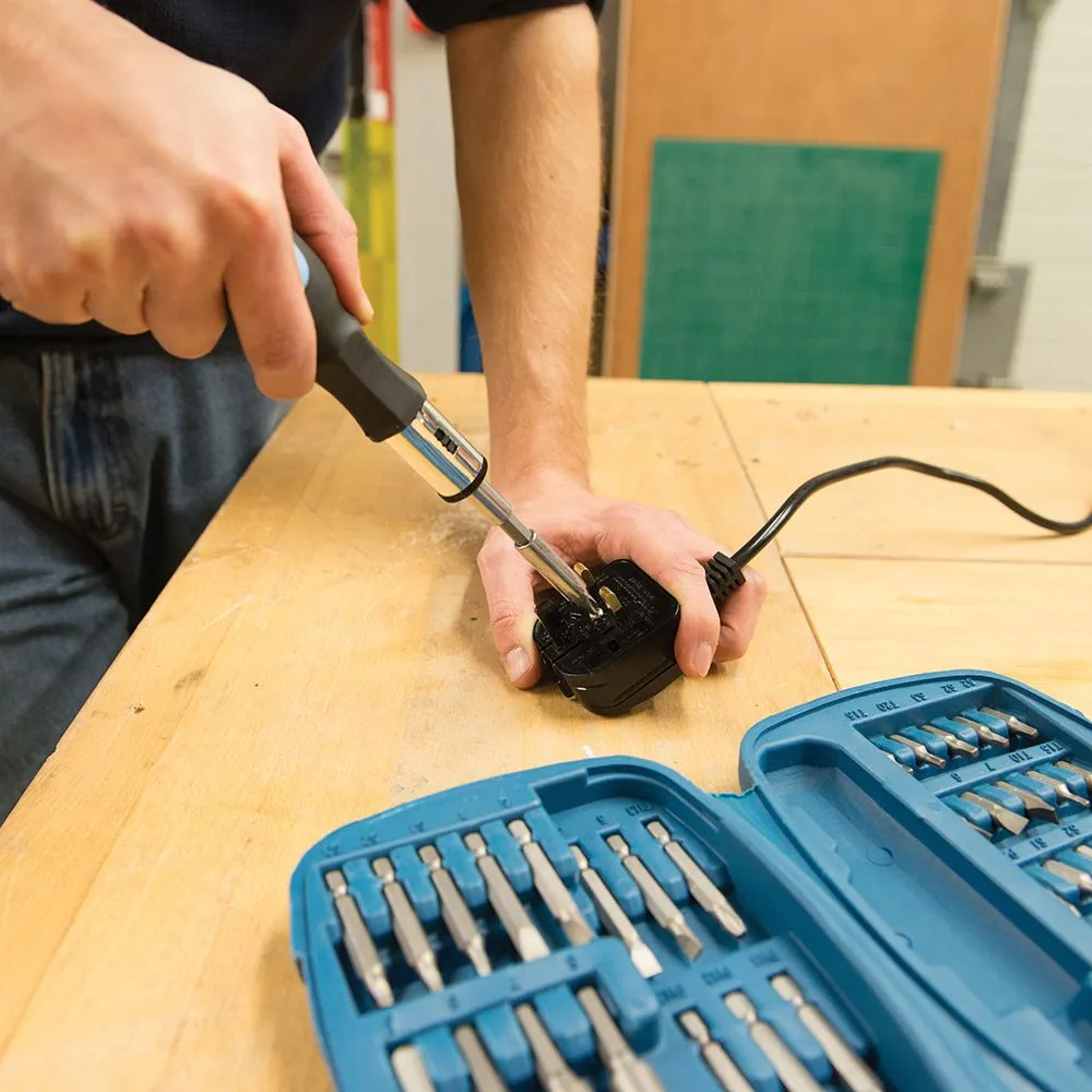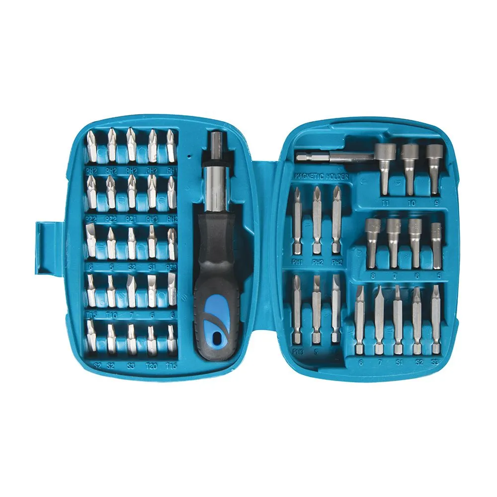 Rękojeść typu Softgrip z przełącznikiem obrotów: prawo, lewo, blokada. 60 mm - magnetyczna przedłużka do bitów. Sześciokątny Bit 1/4". Bity 25 mm: płaskie 1 x 5mm, 3 x 6mm, 1 x 7mm; krzyżakowe Phillips 1 x PH1, 5 x PH2, 1 x PH3; Pozidriv: 1 x PZ1, 2 x PZ2, 1 x PZ3; Trx z otworem 1 x T10, 2 x T15, 1 x T20; Specjalne: 1, 2 x 3, 1 x 3. Bity 50 mm: płaskie 1 x 5mm, 2 x 6mm, 1 x 7mm; krzyżakowe Phillips 1 x PH1, 2 x PH2, 1 x PH3; Specjalne: 1 x 1, 1 x 2, 1 x 3; nasadki 5 - 11 mm.