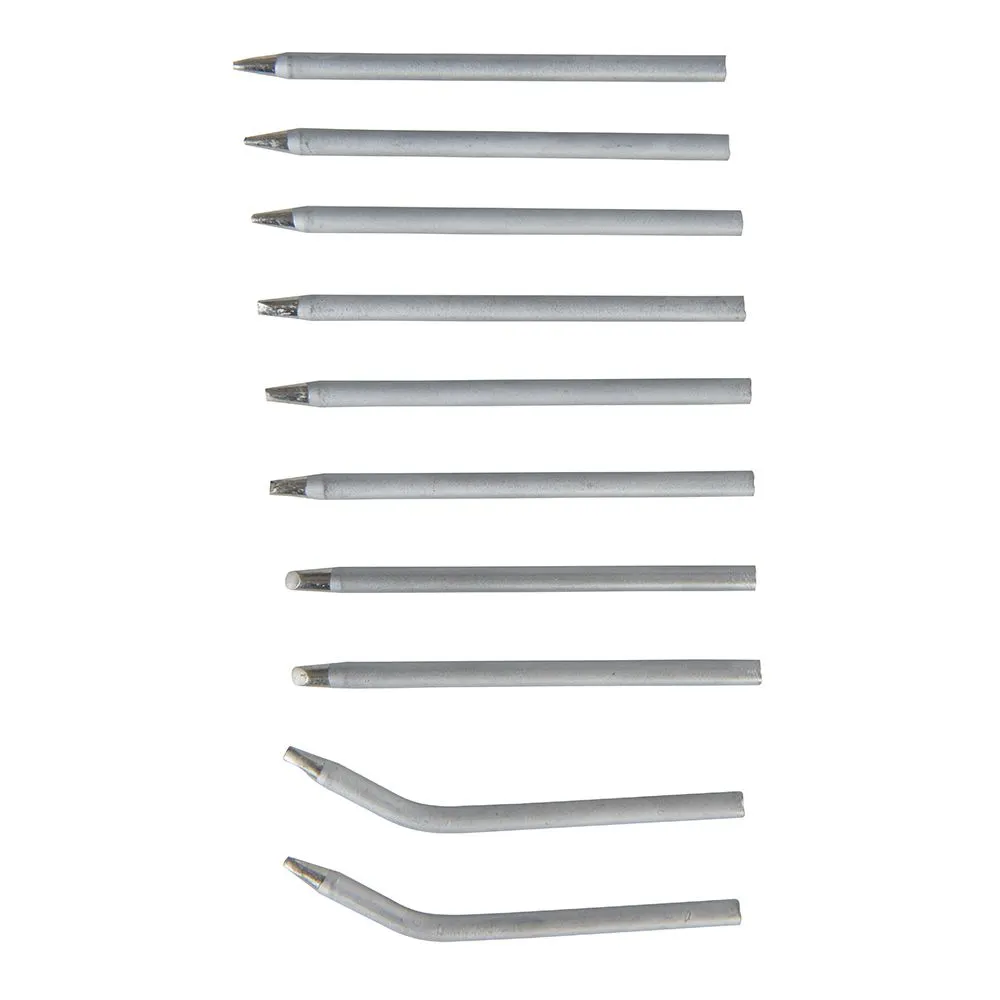 Wstępnie cynowane końcówki lutownicze o średnicy zewnętrznej 3,8 mm. 15 W oraz 25 W kompatybilne z lutownicami grzałkowymi 15 W oraz 25 W. 40 W kompatybilne z lutownicami grzałkowymi 40 W marki Silverline. W zestawie końcówki lutownicze: 3 x punktowe, 3 x dłutowe, 2 x zakrzywione, 2 x odcięte.