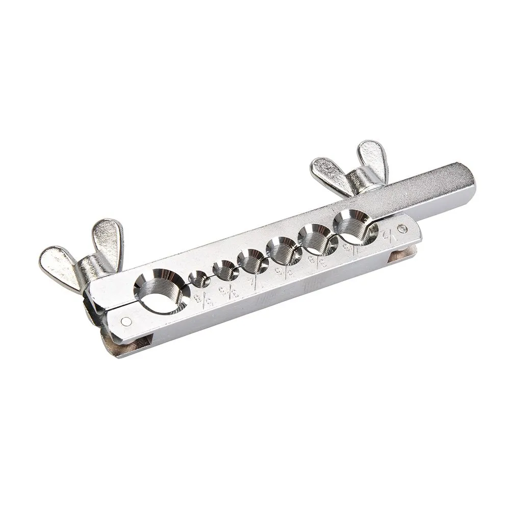Stal węglowa z chromowaną matrycą i praską. Przeznaczony do pojedynczego lub podwójnego rozszerzania końcówek rur z miedzi, aluminium. W zestawie znajduje się: prasa z końcówką stożkową o kącie 45° oraz podwójna matrycę z 7 otworami o rozmiarach wyrównania: 3/16 ", 1/4", 5/16 ", 3/8", 7/16 ", 1/2" i 5/8 ". Całość zapakowana w plastikowym etui.