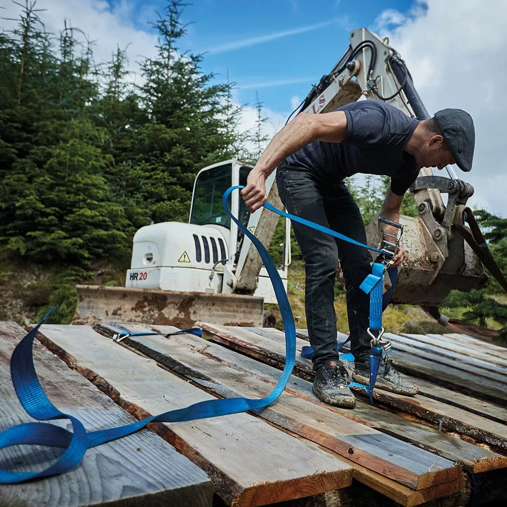 Cały zestaw w jednym. Pasy wykonane z solidnego poliestru odpornego na warunki atmosferyczne. Wzmocnione szwy wokół haków typu J, zapadka umożliwia długa eksploatację produktu. Podwójna blokada zapadki, sprawia, że nie istnieje ryzyko rozłączenia, bądź utraty naprężenia podczas użytku póki uchwyt nie zostanie zwolniony. Zabezpiecza samochody osobowe na lawetach dzięki masywnej konstrukcji zapadek. W komplecie 4 x 3 m pasy transportowe z napinaczem, 4 x 320 mm pasy szelkowe oraz pasy szelkowe z ogniwami 4 x 320 mm, wszystko w nylonowej torbie z zamkiem błyskawicznym. Zgodne z BSEN12195-2:2000.