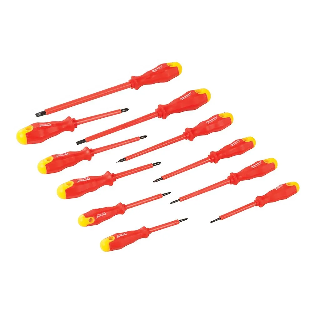 Hartowana chromowo-wanadowa stal trzpienia z chemicznie czernioną końcówką. Izolowany trzpień oraz ergonomiczny, sześciokątny profil uchwytu zapewnia kontrolę pracy. Sprawdza się doskonale do delikatnej pracy w elektryce o raz motoryzacji gdzie przewody i punkty kontaktowe są gęsto ułożone. W zestawie wkrętaki: Phillips (#0 x 60, #0 x 75mm, #1 x 80 mm, #1 x 100 mm, & #2 x 100 mm) oraz płaskie (2,5 x 75 mm, 3 x 100 mm, 4 x 100 mm, 5 x 125 mm, 6 x 150 mm oraz 8 x 175 mm). Brak oceny ochrony.