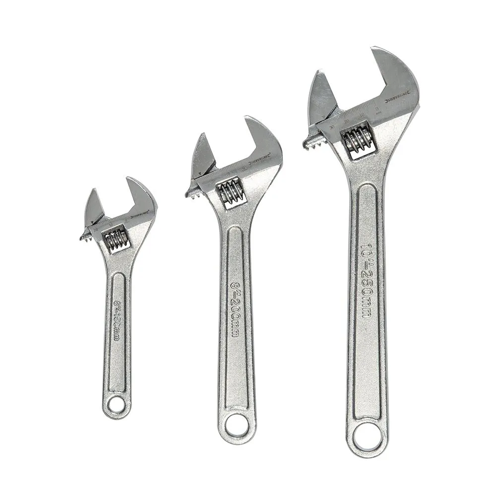 Kuta matrycowo chromowana stal węglowa kluczy nastawnych. Polerowana stal szczęk. Wymiary: długość całkowita/ szerkość szczęk: 50 x 17 mm, 200 x 22 mm and 250 x 27 mm.