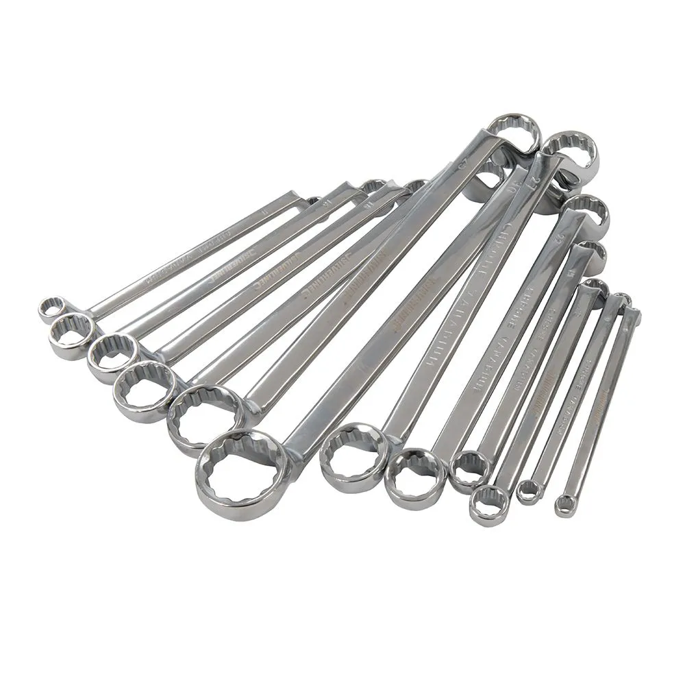 Klucze oczkowe wygięte ułatwiają dostęo do zagłębionych elementów. Wykonane z kutej matrycowo hartowanej stali chromowo-wanadowej. Wysokiej jakośći w całości wypolerowane. W komplecie z nylonowym rolowanym etui. W zestawie klucze w rozmiarze metrycznym: 6 x 7, 8 x 9, 10 x 11, 12 x 13, 14 x 15, 16 x 17, 18 x 19, 20 x 22, 21 x 23, 24 x 27, 25 x 28, 30 x 32 mm