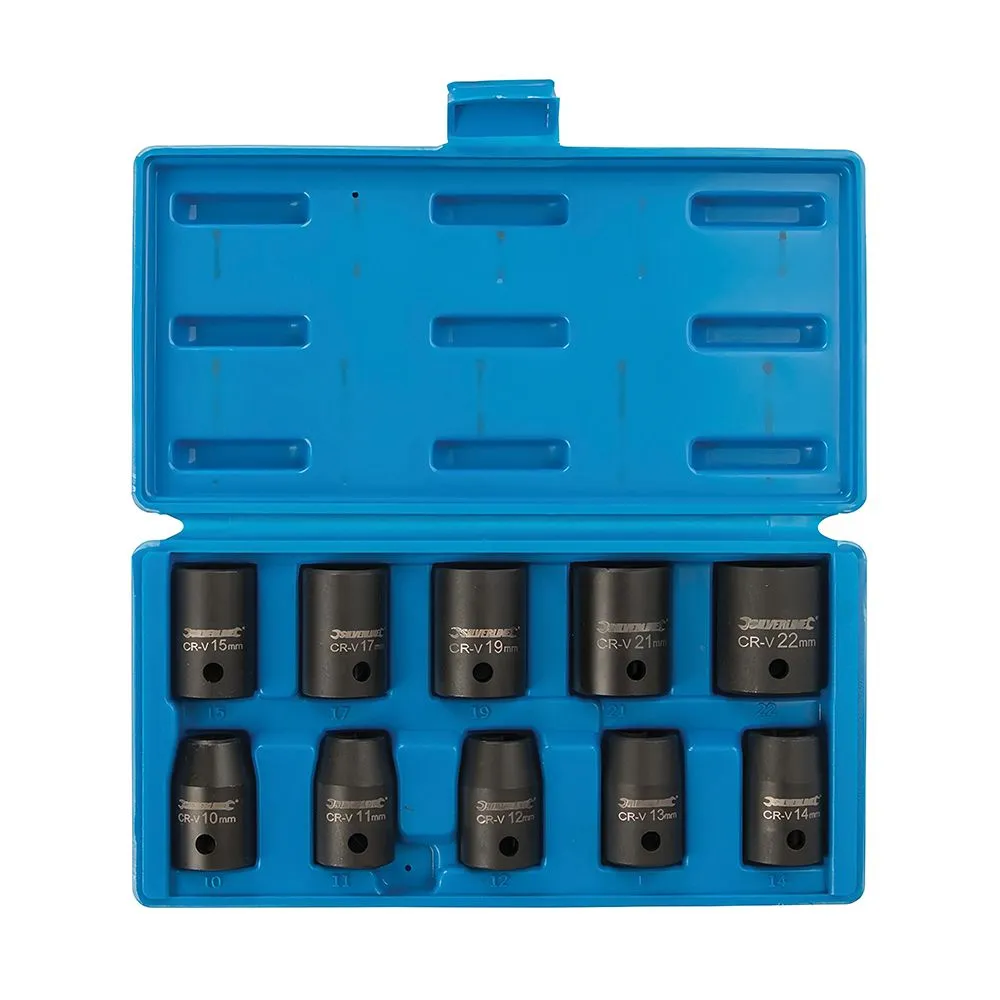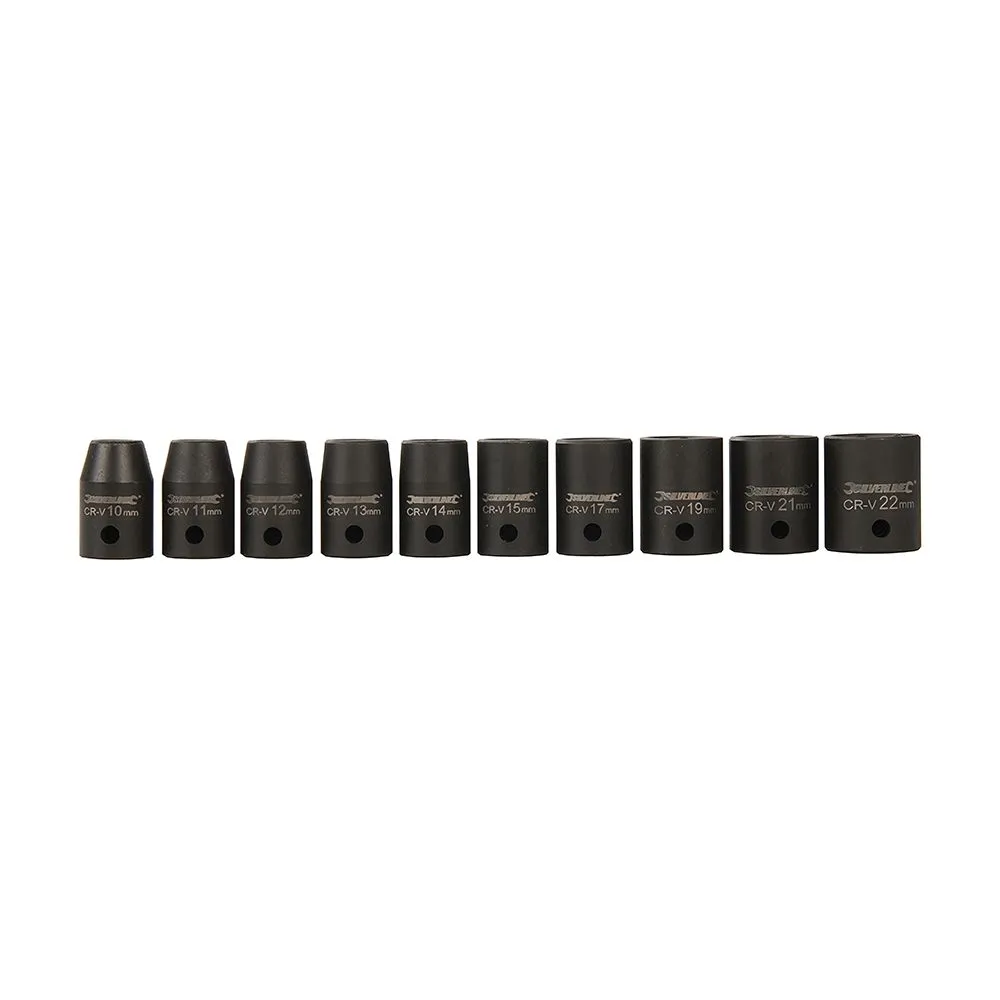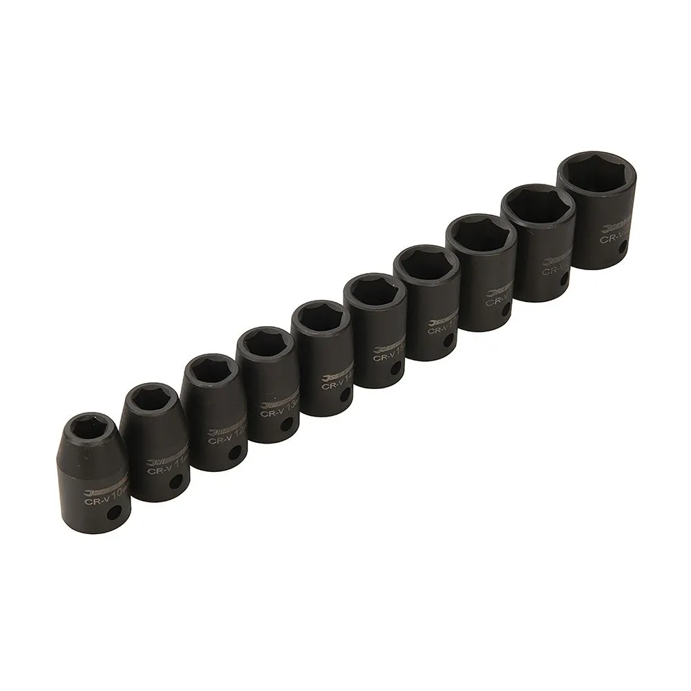 Metryczna nasadka udarowa sześciokątna specjalnie do użytku z narzędziami udarowymi. Precyzyjnie kute na zimno, z hartowanej i odpuszczanej chromowo-wanadowej stali. Laserowo oznaczone rozmiary, przedłużki poddane fosforanowaniu dla najwyższej odporności na korozję. Grube ścianki dla wytrzymałości i żywotności narzędzia. Otwory po bokach do zatrzasków kulkowych lub sworzni. W zestawie: 10, 11, 12, 13, 14, 15, 17, 19, 21 i 22 mm.