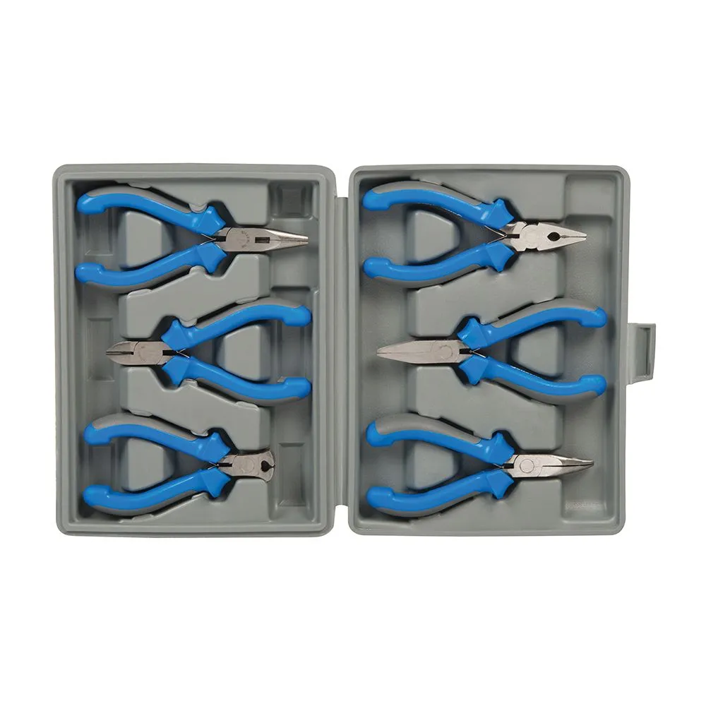 Zestaw 6 mini szczypcy w dwukolorowych rękojeściach PVC ze sprężyną rozwierającą. Zestaw zawiera: szczypce tnące boczne 110 mm, kombinerki 125 mm, szczypce półokrągłe proste 125 mm, szczypce tnące czołowe 100 mm, szczypce półokrągłe proste ścięte 125 mm, szczypce półokrągłe wygięte 125 mm, zestaw umieszczony w poręcznym futerale.