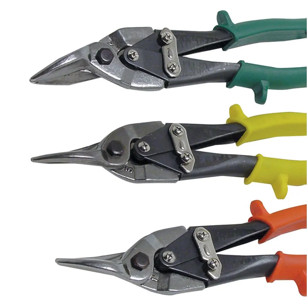 Chromowo-wanadowa stal nożyc o wysokiej dźwigni. Sprężynowe miękkie uchwyty z osłonami antypoślizgowymi i zatrzaskami bezpieczeństwa, oznaczone kolorami do cięcia prostego, w prawo i lewo. Przeznaczone do cięcia aluminium, miękkiej stali oraz stali nierdzewnej, arkuszy PCV, siatki drucianej, skóry, miedzi i plastiku. Zdolność cięcia: blacha aluminiowa 1,2 mm, miękka stal 0,8 mm, stal nierdzewna 0,6 mm. Rozpiętość szczęk 20 mm. Długość 240 mm.