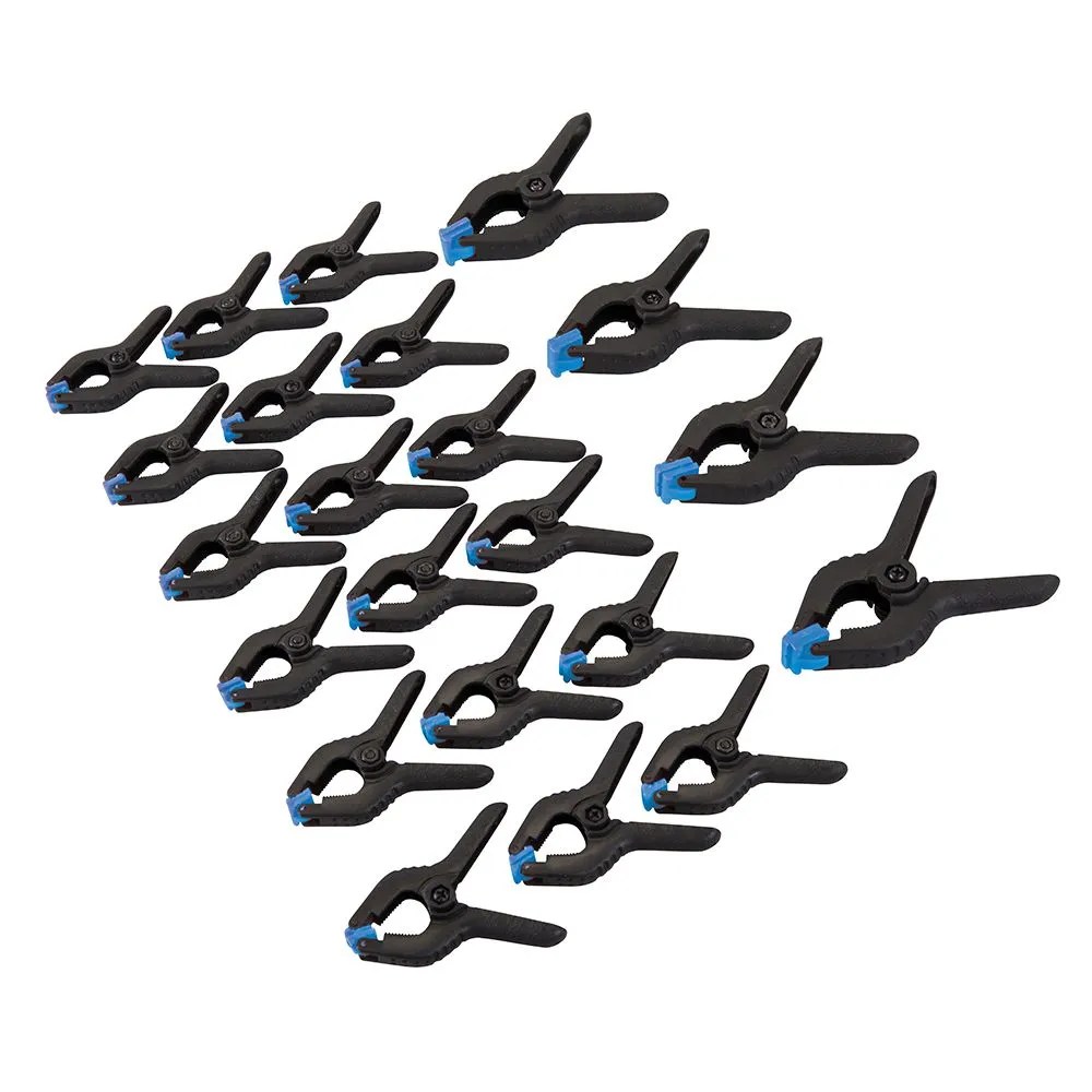Odporna na uderzenia konstrukcja z nylonu i włókna. Hartowana stal sprężynowa, dla silnego ścisku. Elastyczne końcówki przytrzymują obiekt w prawidłowym położeniu. Zestaw zawiera: 4 x ścisk sprężynowy 25 mm, 18 x ścisk sprężynowy 19 mm.