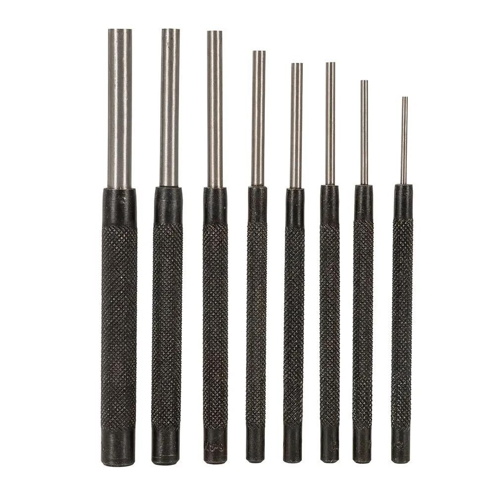 Hartowana i kuta stal. Radełkowany uchwyt dla lepszej przyczepności. Umożliwia usuwanie nitów i szpil. W zestawie wybijaki: 2.4; 3.2; 4; 4.8; 5.6; 6.4; 7.9 i 9.5 mm.